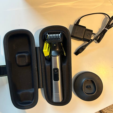 Philips trimmer med flere utskiftbare hoder og kammer. Settet inkluderer selve trimmeren, en presisjonstrimmer, justerbare kammer og en liten oppbevaringspose. Egnet til trimming og forming av skjegg, bart og ansiktshår. Drevet av strøm eller oppladbart batteri (se egen informasjon fra selger for detaljer om strømforsyning).