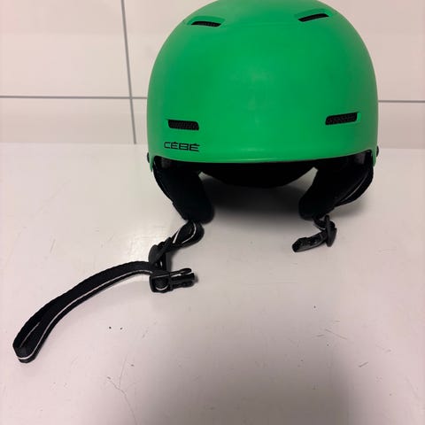 Den grønne hjelmen er merket JR S (51–54 cm). Den har ventilasjonsåpninger, enkel justering bak og hakereim med klipslås. Ytterskallet er i hardplast med dekorstripe bak.