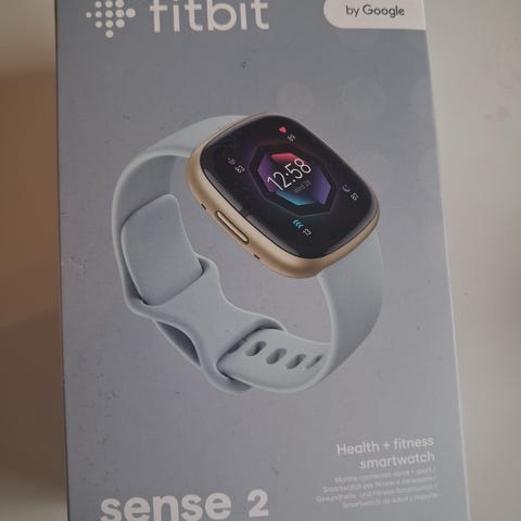 Fitbit sense 2 med svart slitt gummireim som bør byttes, og rosa justerbar reim selges billig.