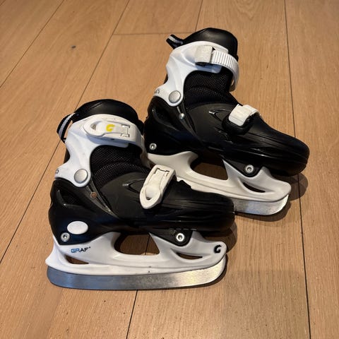 Justerbare Graf barneskøyter i størrelse 30-33. Skøytene har justerbar plast- og tekstiloverdel i svart og hvit med spenner for enkel tilpasning og lukking. Egner seg som allround skøyter til barn for bruk på isbaner og skøytebaner.