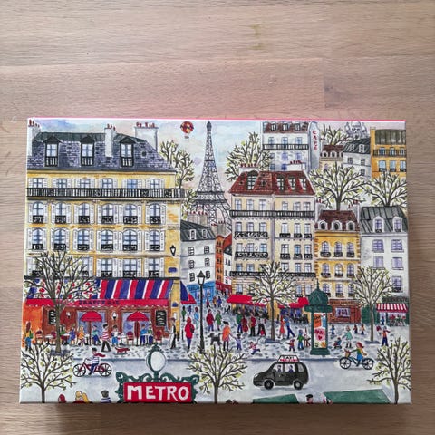 Ferdig puslet måler det ca. 70 x 50 cm. Esken er åpnet men det er ikke puslet og ligger fremdeles i lukket plastpose.