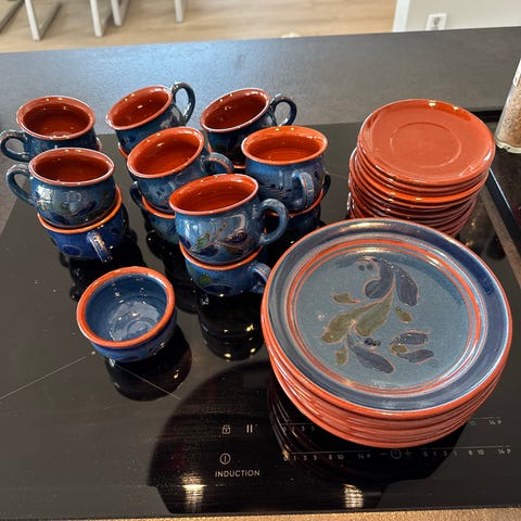 Keramikk lysestaker og fat med blå dekor og brune kanter fra Aune keramikk i Trondheim. Selges samlet for kr 500 eller pr del; minste deler kr 100 og største deler kr 150.
