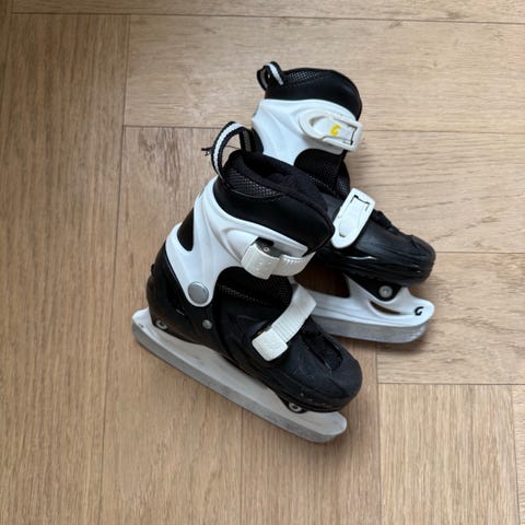 Graf barneskøyter i størrelse 33. Skøytene har justerbar plast- og tekstiloverdel med snøring, borrelåsrem og spennelukking for stabilitet rundt ankelen. Fargekombinasjon i blått, hvitt og svart. Egnet for barn til generell skøytebruk på is.