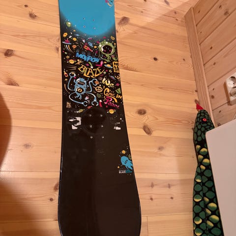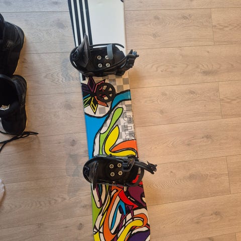 Brettet ble kjøpt brukt på Finn.no, men viste seg å være i feil størrelse. Vi har ikke brukt det. Enkelte bruksmerker på brettet, men stort sett ganske fint. Bindingene ser bedre ubrukte ut. Bindingene er festet til brettet med tre skruer, men en av disse mangler på den bakre bindingen. Tror ikke det betyr så mye for bruk da bindingen likevel er festet godt, men brettet selges derfor billig. (Evt ekstra skruer kan kjøpes på nett for under 100kr ser det ut til.)