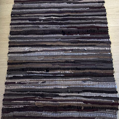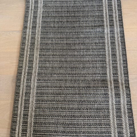 Bohus fillerye teppe i blått- og hvitmelert mønster. Rektangulær løper med frynser i endene. Passer for eksempel i gang, kjøkken eller andre smale rom. Materialet fremstår som vevd tekstil. Egner seg til innendørs bruk på harde gulv som parkett eller laminat.