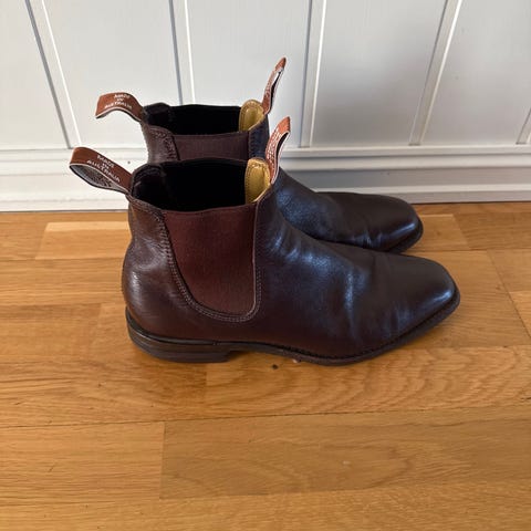 Meget pent brukte Chelsea boots fra R.M.Williams. Skoene er håndlaget i Australia med overdel laget av et stykke yearling-skinn med én enkelt søm ved hælen for å maksimere komforten.