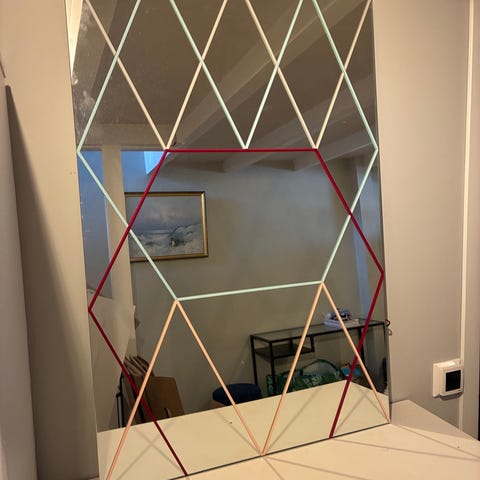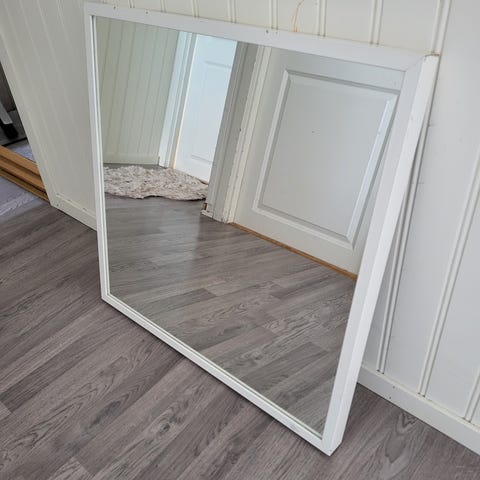 Speil med kraftig ramme. Lengde 120cm, bredde 80 cm. Brunlig farge.