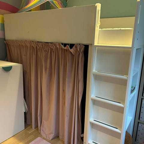IKEA høyseng med integrert skrivepult og oppbevaringsløsninger. Under sengen er det en stor skriveflate som egner seg til lekser, tegning eller hobbyaktiviteter. På den ene siden er det åpne hyller i flere nivåer for bøker, leker eller annet utstyr. På den andre siden er det en skuffeseksjon med flere skuffer samt et skap med dører for lukket oppbevaring. Sengen nås via en fastmontert stige i front. Egner seg til barnerom der man ønsker å kombinere soveplass, arbeidsplass og oppbevaring på et lite areal.