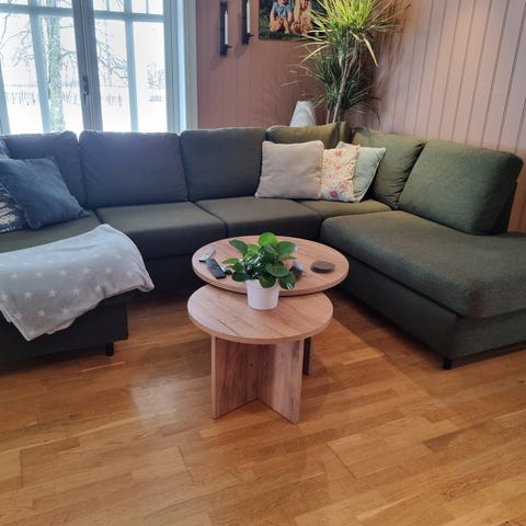 Malte Hjørnesofa i olivengrønn selges grunnet flytting. Kjøpt til 11.999kr høsten 2022.