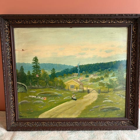Stilig ramme i tre, gullfarget. Har noen sprekker, men henger fortsatt greit sammen:)