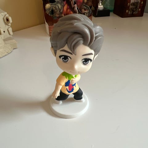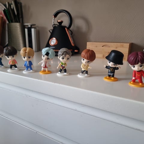 Tre små McDonald's figuriner i plast. Figurene står på runde sokler i hvit og oransje farge. To av figurene har brunt hår og gule jakker, mens den midterste har lyst blått hår og hvit antrekk med røde detaljer. Egnet som samling, pynt eller lekefigurer.