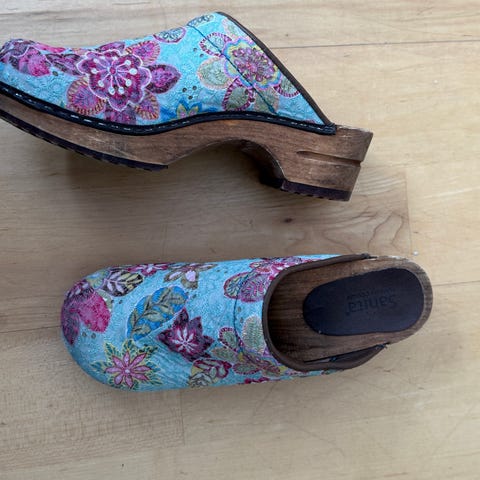 Selger et par originale Torpatoffeln tresko i størrelse 36, modell «Cherry Blossom».