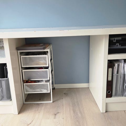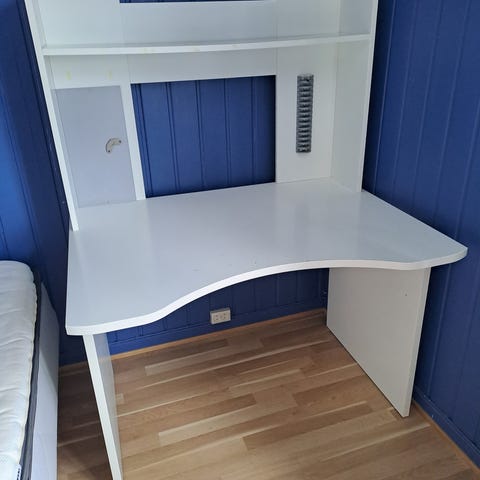 Praktisk skrivebord med uttrekk til tastatur og eget skap til printer. Tilhørende hylle.