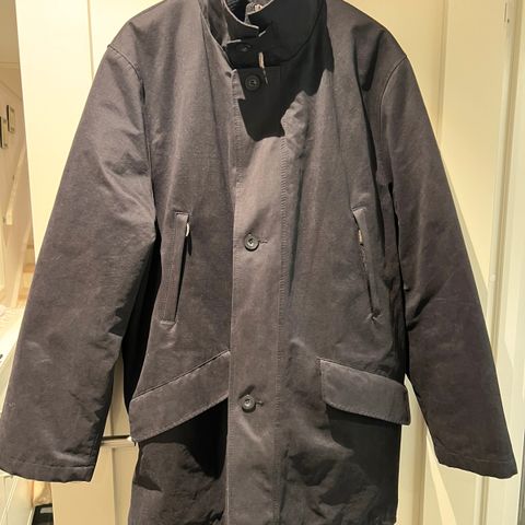SAND jakke for herre i størrelse 50. Jakken er blå og har en brun vest inni som kan tas ut om man ønsker en mindre varm jakke. Den har høy krage, glidelåslukking og flere lommer i front. Passer som ytterjakke i til fine anledninger. Er også en integrert hette i kragen.