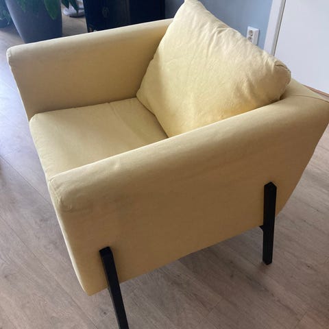 IKEA lenestol i grå tekstil. Stolen har rette linjer med brede armlener og løs ryggpute. Trekket er i vevd stoff, og stolen står på mørke ben. Passer i stue, TV-krok eller som ekstra sitteplass i andre rom.