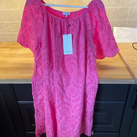 Sorbet sommerkjole for dame i størrelse M. Kjolen er rosa med blomstrete mønster og har tynne stropper. Den er laget i polyester og har et lett og luftig uttrykk som passer til varme dager. Egner seg godt til hverdagsbruk eller enkle sommeranledninger.
