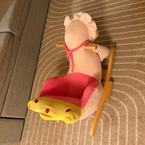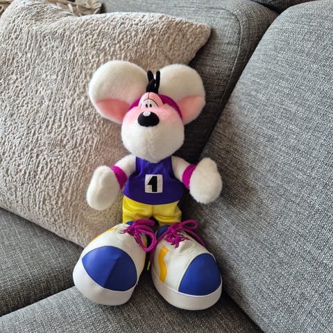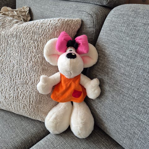 Diddl kosedyr i form av en stor hvit og rosa mus. Figuren har store ører, store rosa poter med svarte prikker og lang hale. Kosedyret er kledd i gul selebukse med blå knapper og brodert Diddl-logo på forsiden. Mykt materiale egnet som koseleke eller pyntegjenstand på barnerom. Samleobjekt. Kjøpt i bokhandel på 90-tallet. Liten sprekk i øyet. Se bilde.