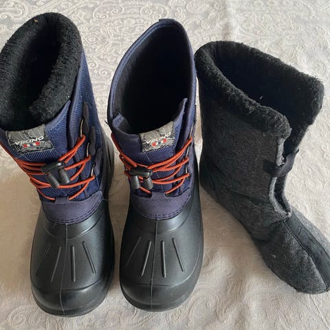 Viking vinterstøvler for barn/unisex i størrelse 37. Støvlene har mørk blå overdel med snøring foran og sort gummiert nederdel. Fôret innside med ullblanding for ekstra varme, som kan tas ut for enkel vask og tørk.