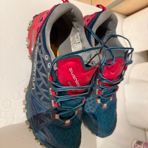 La Sportiva joggesko i størrelse 39. Skoene har overdel i syntetisk materiale/mesh i blå med rosa detaljer. Yttersålen har kraftig mønster for godt grep på variert underlag. Modellen egner seg til løping og turbruk på sti og grus. Innsiden har tekstilfôr for komfort. Snøring foran for justering av passform.