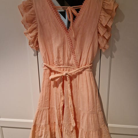 Va Vite sommerkjole for dame i størrelse 44 Kjolen er rosa og laget i bomull. Modellen har V-hals med blondekant, korte volang-ermer og knytebelte i livet. Skjørtet er lett utsvingt med flere volanger for et luftig uttrykk. Passer som sommerkjole i hverdagen eller til enkle anledninger.