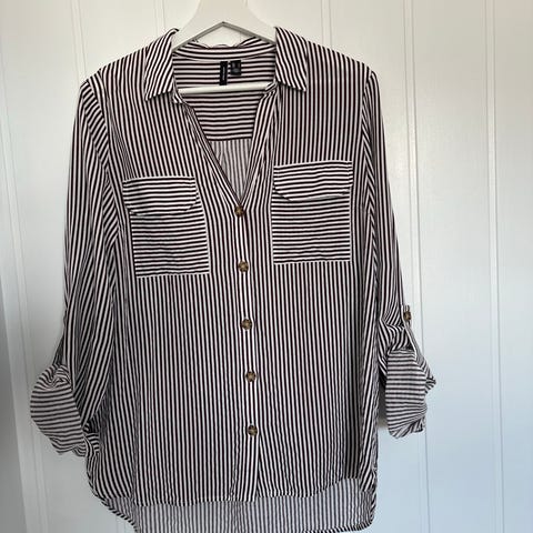 ICHI topp for dame i størrelse S. Toppen er brun med vertikale hvite striper og har lange ermer. Den har v-utringning og knepping foran. Passer til hverdagsbruk og kan kombineres med både bukser og skjørt.