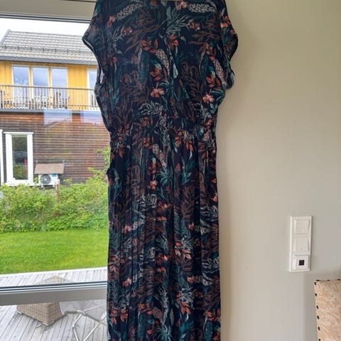 KAFFE sommerkjole for dame i størrelse 42. Kjolen er hvit med blomstermønster og er laget i bomull. Den har rynket overdel, lange ermer med strikk ved mansjettene og vid skjørt. Passer som lett sommerkjole til hverdagsbruk eller enkle anledninger.