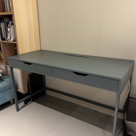 Pent brukt skrivepult, i grønn-grå farge. Kjøpt på IKEA for noen år tilbake.