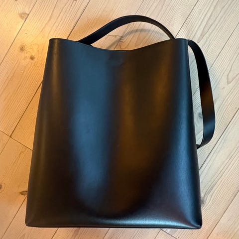 Tidløs Arket- skinnveske i superfinmørk sjokoladebrun farge. Vesken er laget i glatt lær med justerbar skulderrem og åpen topp. Passer til hverdagsbruk og har plass til nødvendigheter, men óg laptop/ iPad. Enkel og minimalistisk design med Arket-logo på siden. Svært lite brukt, fortjener sårt ny eier.