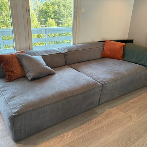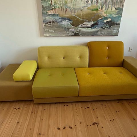 Vi kjøpte den på finn for 1 år siden nesten ubrukt. Velourstoff i nydelig gul/oransje farge.