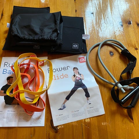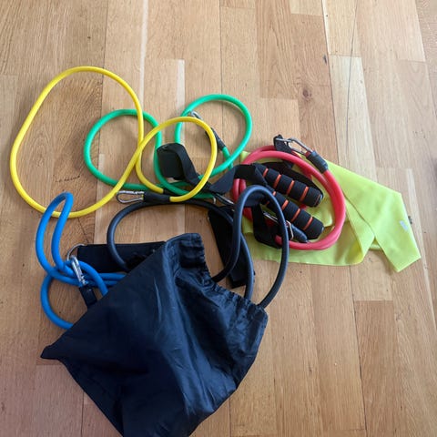 Treningsutstyr pakke med manualer, treningsstrikker og hoppetau. Inneholder flere par små manualer i ulike farger og vektklasser, samt et utvalg treningsstrikker og motstandsbånd i forskjellige lengder og motstandsnivåer. Egnet til styrketrening, oppvarming, uttøying og hjemmetrening. Utstyret kan brukes til helkroppsøvelser, rehabilitering og generell mosjon, både innendørs og utendørs.