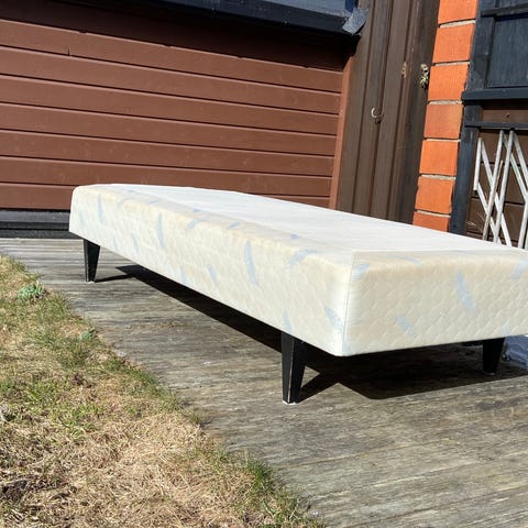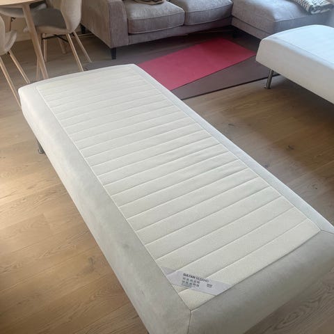 IKEA Sultan Singås madrass, grå i fargen, pent brukt, uten flekker. Overmadrassen følger med. Ben 4 stk i heltre følger med også.