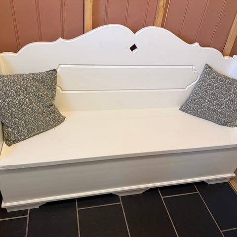 Benken fungerer godt som sitteplass til spisebord og det er mye forvaringsplass inni benken. Et støttebein er litt løst, men det bærer ikke noe tyngde når ikke liggedelen er trekt ut (se bilde).