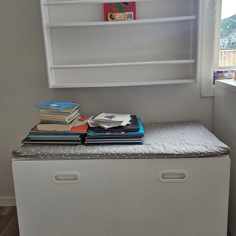 Både bokhyllen og tallerkenhyllen er gamle, kanskje 70-80 år gamle. Jeg har malt de og skiftet knotter, men begge kan trenge er nytt strøk maling med mindre man ønsker ‘shabby chic’ finish.