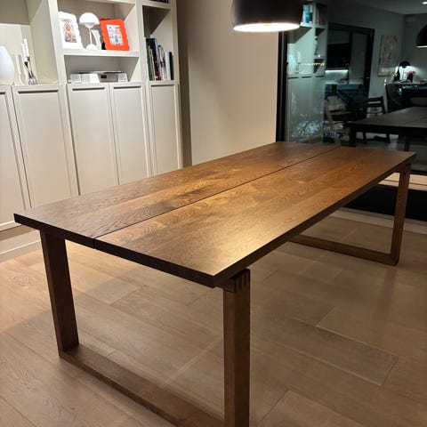Skagen spisebord i heltre eik fra Bolia: 265x70 cm. Det følger med to pene ileggsplater à 50 cm. Bordet kan romme 14 personer med illeggsplater. Noen bruksmerker som enkelt kan ordnes med sliping og olje.