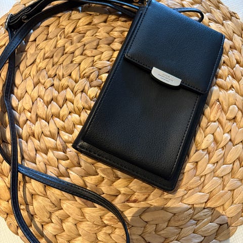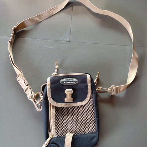 Ubrukt svart mobilveske med bærestropp med tre rom. Kan festes på armen.