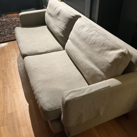 Godt brukt sofa fra Hødnebø, rammen og putene er ok, god å sitte i, men bør trekkes om. Kloremerker etter katt. Må hentes