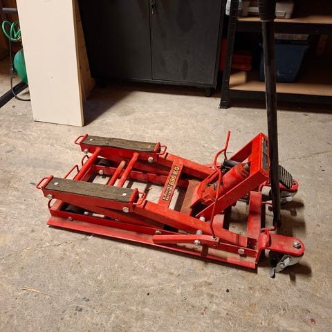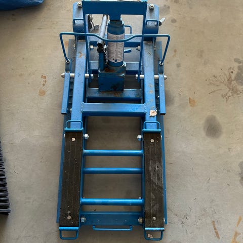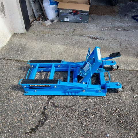 Brukt kanskje en eller to ganger. Hydraulisk motorsykkeljekk i blå farge. Jekken har fotpedaler for løft og senking, samt hjul som gjør den enkel å flytte. Brede gummierte plattformer gir støtte til motorsykkelens ramme ved løft. Egnet for løfting og vedlikeholdsarbeid på motorsykler og lignende kjøretøy innenfor angitt vektkapasitet på produktet.