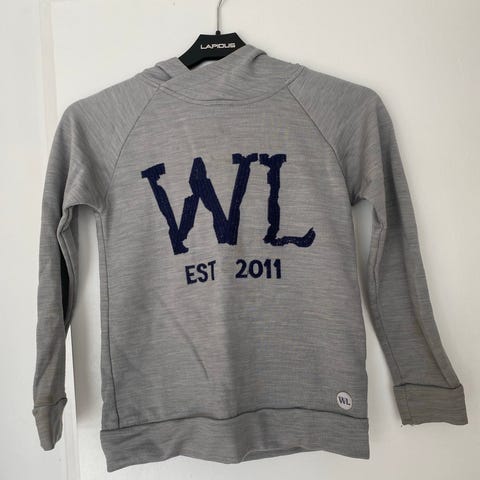 WoolLand genser til barn i størrelse 98-104. Genseren er blå og laget av 100 % merinoull. Den har høy hals med glidelås, lange ermer og lomme foran. På brystet er det WL-trykk med årstallet 2011, og det er stjerneapplikasjoner på ermene.