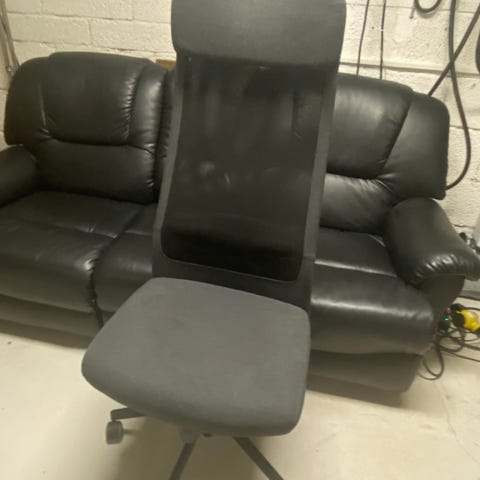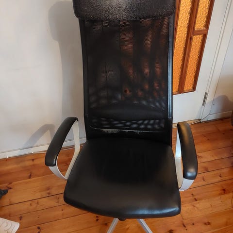 Sort kontorstol i kunstlær, IKEA. Sete og rygg lite slitasje, se bilder. Mye slitasje flere steder. Fungerer fint. Justerbar rygg.
