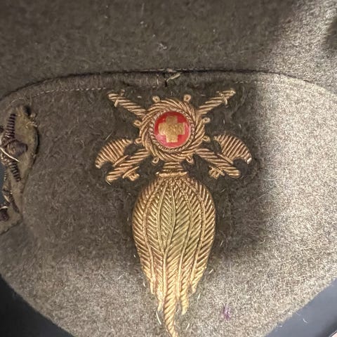 Unione Militare Marte militær offiserslue i grå tekstil med innvendig merking «Marte – Lavorazione speciale – Unione Militare – Tirana». Luen har brodert merke foran med kors og korslagte symboler i gullfarget tråd, samt gullfargede bånd rundt bremmen. Skinnrem og knapp med motiv på siden. Innside i lys tekstil med trykt emblem..500/bud. Skinn lappen foran er løsnet. Bærer preg av mange år på loft.