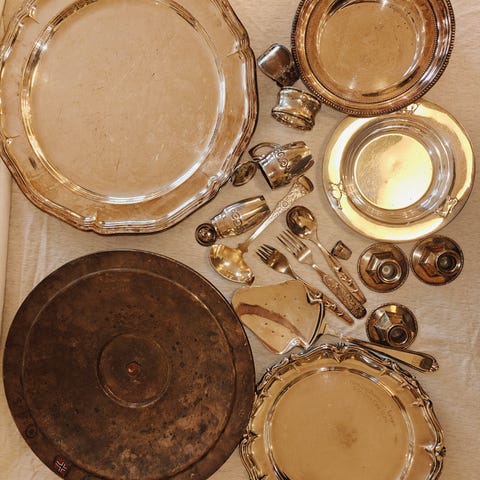 Sølvplett fat, bestikk, kakespader