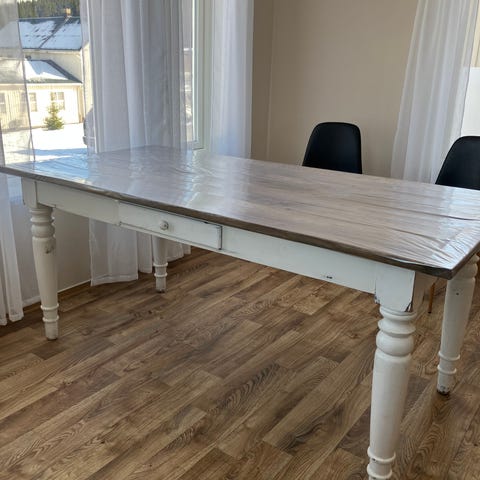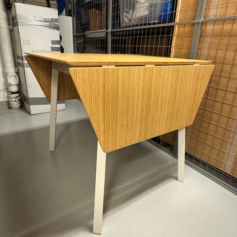 IKEA Tinntorp kjøkkenbord med bordplate av bambus selges på grunn av flytting. Bordet har noen bruksmerker, men er i god stand!