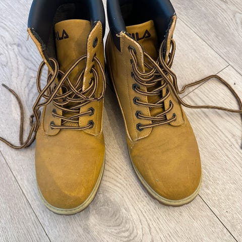 Fila støvler i størrelse 38 i brun farge. Klassiske snørestøvler med polstret kant rundt ankelen og kraftig yttersåle. Egnet til hverdagsbruk og fritid i kjøligere værforhold. Et lite merke på tuppen av den ene støvelen.