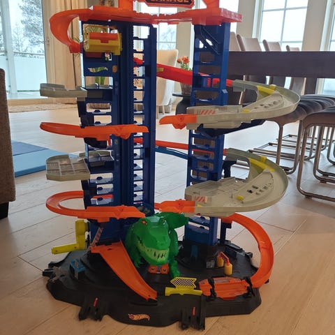 Hot Wheels Ultimate Garage lekesett bilbane. Stor bilgarasje med flere etasjer, ramper og baner til små lekebiler. Settet har plass til mange biler og inkluderer ulike kjørespor, heiser og en stor dragefigur som del av banen. Høyden er rundt 90 cm og lekesettet er egnet for barn fra ca. 3 år og oppover. Passer til standard Hot Wheels-biler.