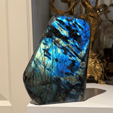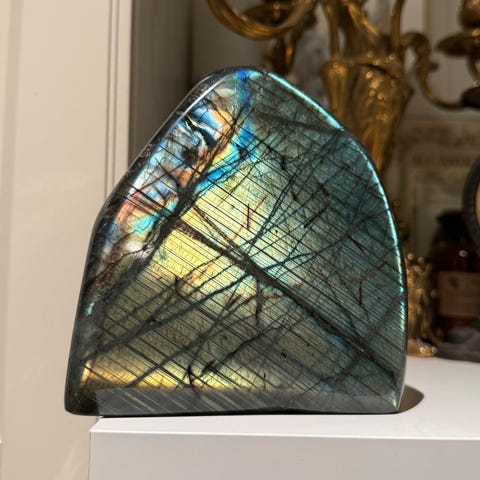 Labradoritt polert stein i flerfargede nyanser med tydelig iriserende spill i overflaten. Egner seg som dekorstein, samlerobjekt eller til bruk i krystallsamling. Formen er uregelmessig med flere polerte flater som fremhever fargespillet i steinen.