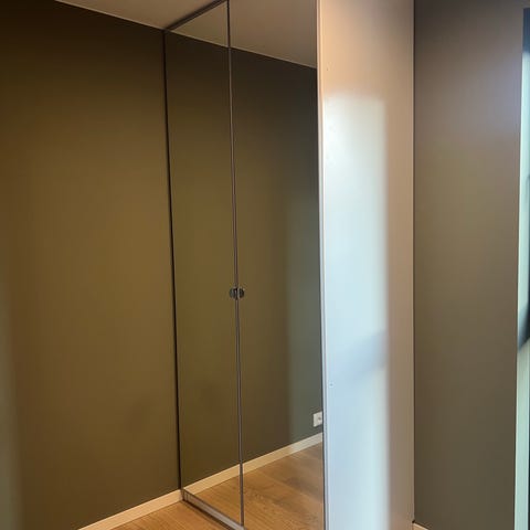 Selger to stk skyvedører til garderobeskap med skinner i gulv og tak. Høyde på dør er 231cm pluss ca 2cm klaring til hjul. Bredde er 102cm.