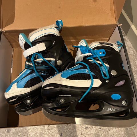 Graf barneskøyter for barn. Modellen er justerbar i størrelse (one size oppgitt i annonsen) og har blå og hvit farge med svarte detaljer.