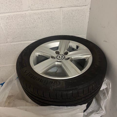 Dekkene har fortsatt godt med mønster og er jevnt slitt. Har vært lagret innendørs. Felgene er i fin stand uten store skader.