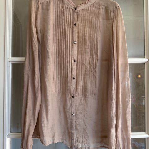 Beige bluse fra Copenhagen Muse i størrelse M, modellen heter Molly. Laget av en blanding av lyocell og polyester. Modellen har lange ermer, klassisk krage og dekorative detaljer langs knappestolpe, krage og ermer. Pent og lite brukt uten flekker eller skader.