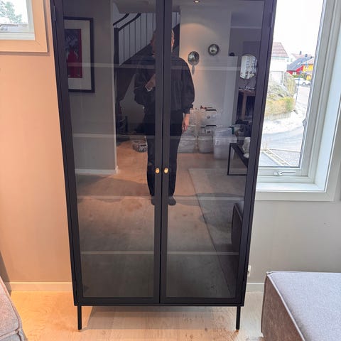 Fra Home and Cottage. Sort jernskap med gull/bronse knotter på dør og ben.